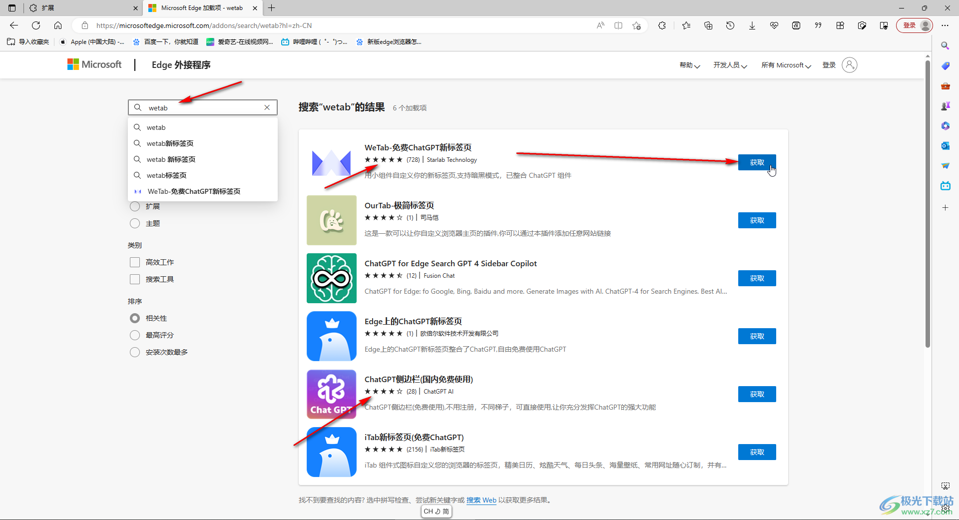 第四步:在左侧输入框输入“wetab”关键词搜索,根据星级和使用人数选择需要的扩展,这里直接点击选择第一个,点击右侧的“获取”按钮,弹出提示窗口后进行确定添加;