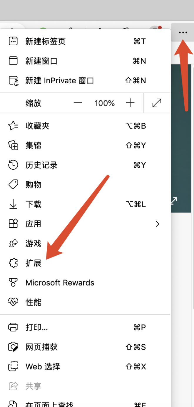 第二步:安装好后,打开edge浏览器 ,找到edge浏览器右上角的三个点图标后单击“扩展”打开,然后再选择“扩展管理”。