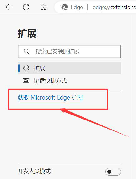 第三步:点击扩展管理后,在打开的新窗口中点击左侧的“获取Microsoft edge扩展”的连接;