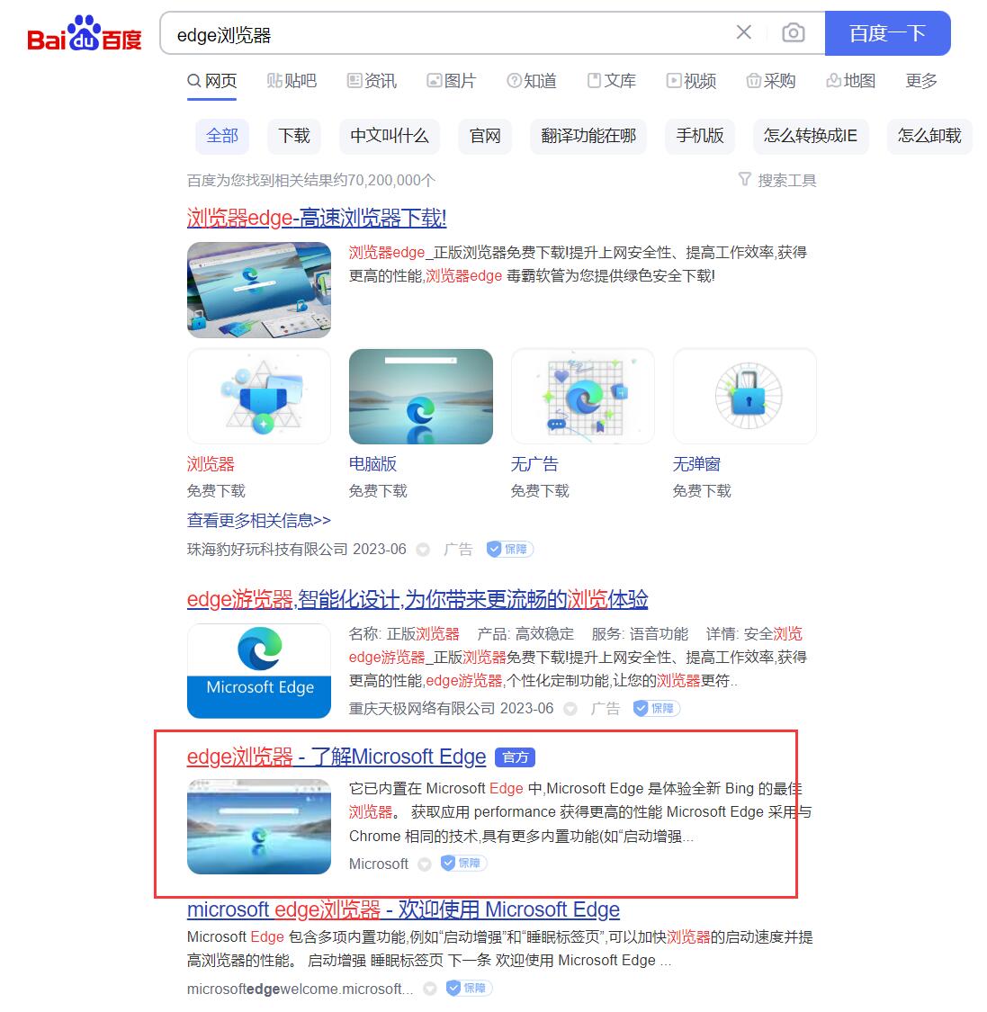 第一步:如果你的电脑还没有安装edge,首先需要下载安装edge官方浏览器,直接在百度搜索“edge浏览器”就行,注意选择微软官方的网站进行下载。